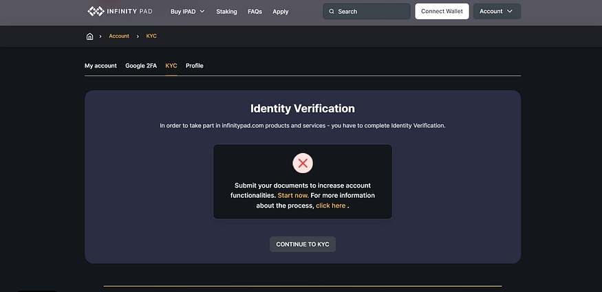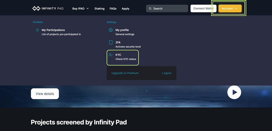 After making sure you have all the necessary supported documents, Proceed to Infinity Pad’s homepage and then Click on “Account” and then choose “KYC” from the expandable menu