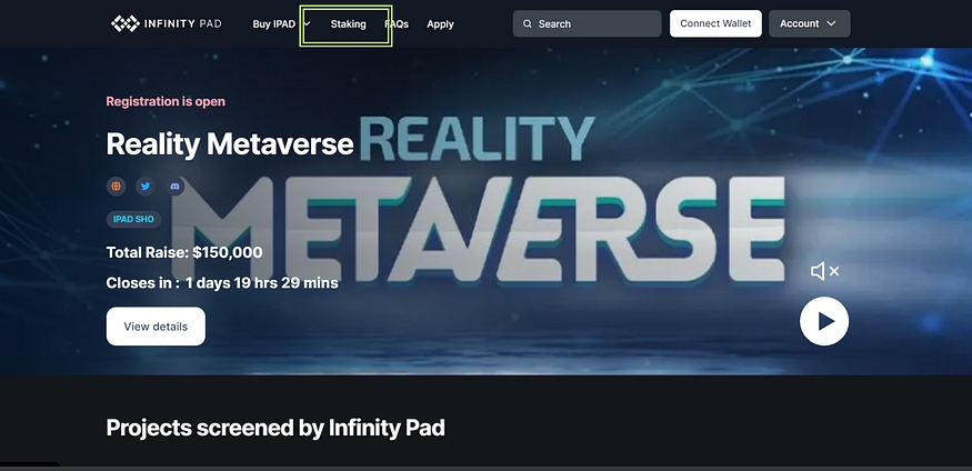 In order to stake your IPAD, first make sure to have IPAD tokens in your wallet and then click on “Staking” in the header menu.